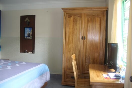 Phòng double trong homestay, diện tích 26m2, ban công cửa sổ, 1 giường lớn, phù hợp cho cặp đôi và người du lịch một mình.